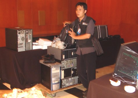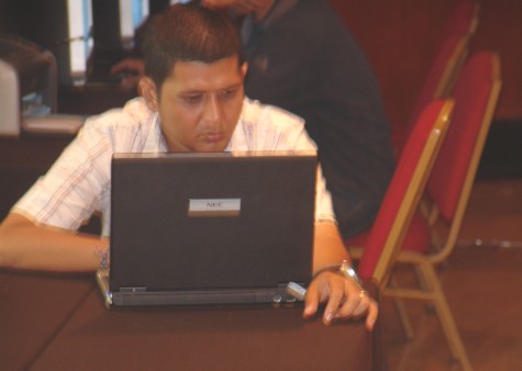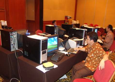 Tampak di ruangan panitia penyelenggara, 10 unit Komputer lainnya yang digunakan dalam kegiatan ini. Pak Tatang dari Deplu (berkemeja cokelat polos, paling belakang), terlihat sedang asik dengan komputer-nya (chating ya pak?).