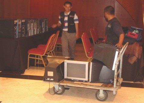 Setelah acara selesai, barang-barang mulai dibereskan. Tampak salah seorang tim RH ProRent membawa 3 unit Laptop (Notebook) dalam tas yang di-rental dalam program (acara) ini.