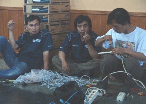 Tampak pada gambar, 3 orang teknisi RH ProRent sedang beristirahat setelah selesai melakukan instalasi ke 60 unit komputer. |