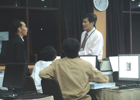 Tampak pada gambar, trainer yang berasal dari negara Malaysia (berdiri berkemeja putih), saat berdiskusi dengan beberapa peserta program pelatihan ini. |